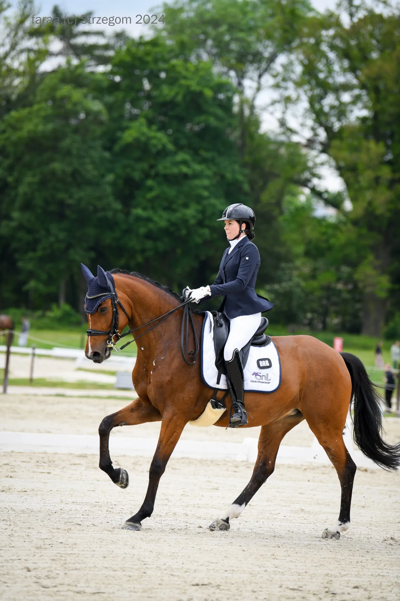 9 klacz rasy sp, startująca na poziomie Małej Rundy (wyniki na poziomie 65-67%), zaczęła elementy Grand Prix (pasaż, piaff, zmiany co 1).