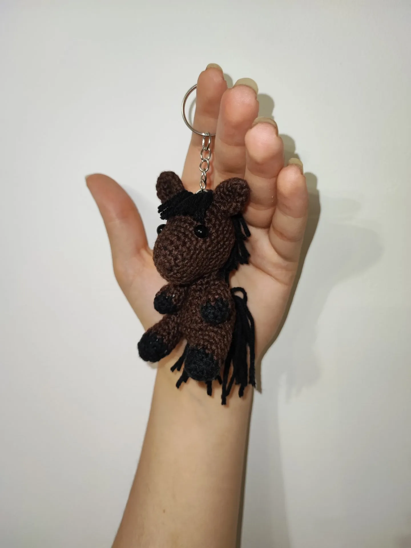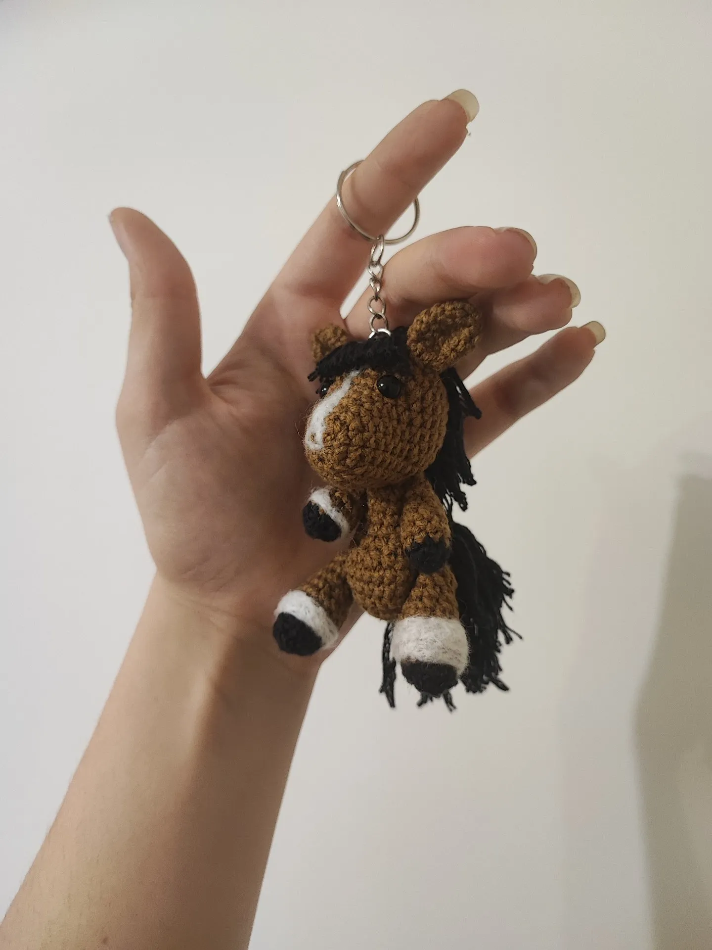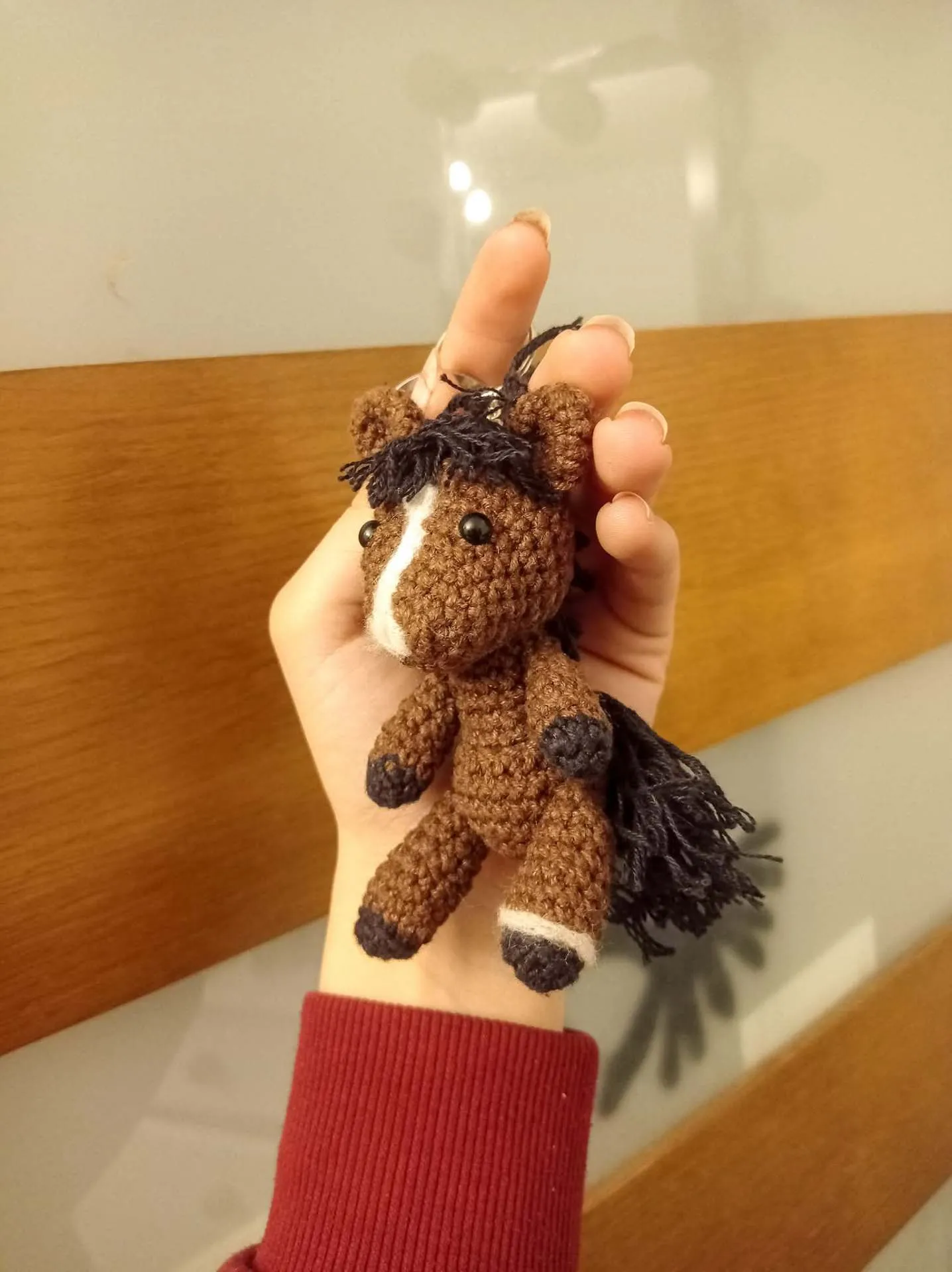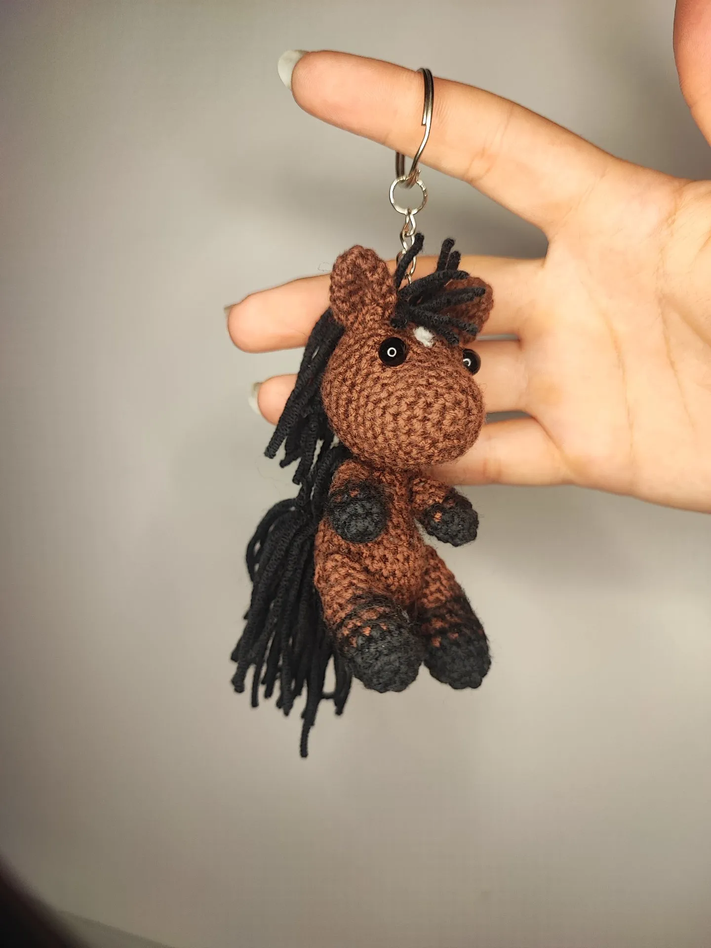 Konik mierzy ok. 8cm (±2cm zależnie od wykorzystanej włóczki) wielkość bardzo poręczna dzięki czemu łatwo go znaleźć w odmętach plecaka czy torby