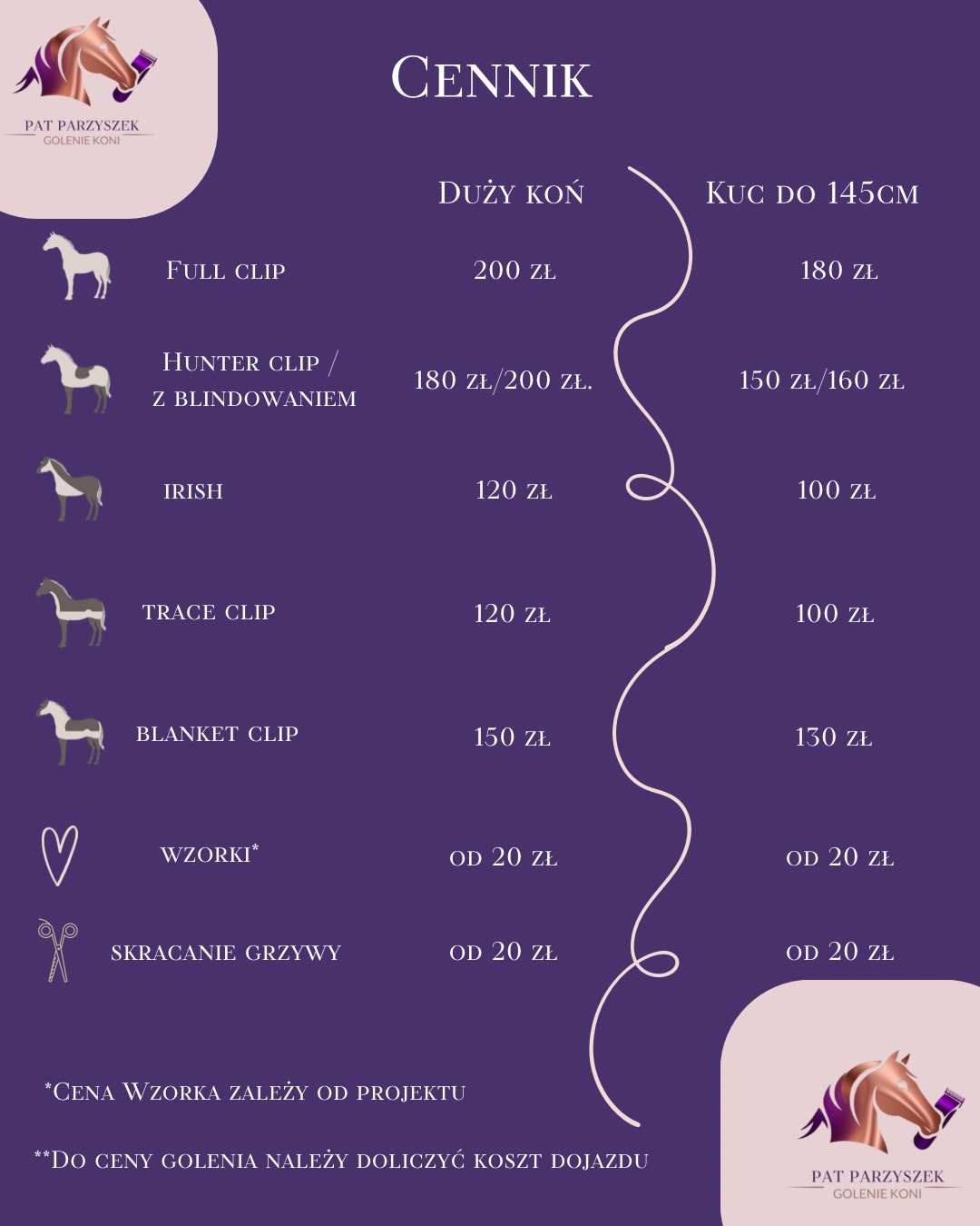 Koń musi być przygotowany do golenia (bardzo dokładnie wyczyszczony lub wykąpany jeśli jest możliwość). W przeciwnym razie pobieram dodatkową opłatę za ostrzenie ostrzy - 70zł. W skrajnych przypadkach, kiedy stan czystości konia nie pozwala na zrealizowania usługi zastrzegam sobie prawo do odmowy golenia w 100% płatne tak, jakby usługa była wykonana.