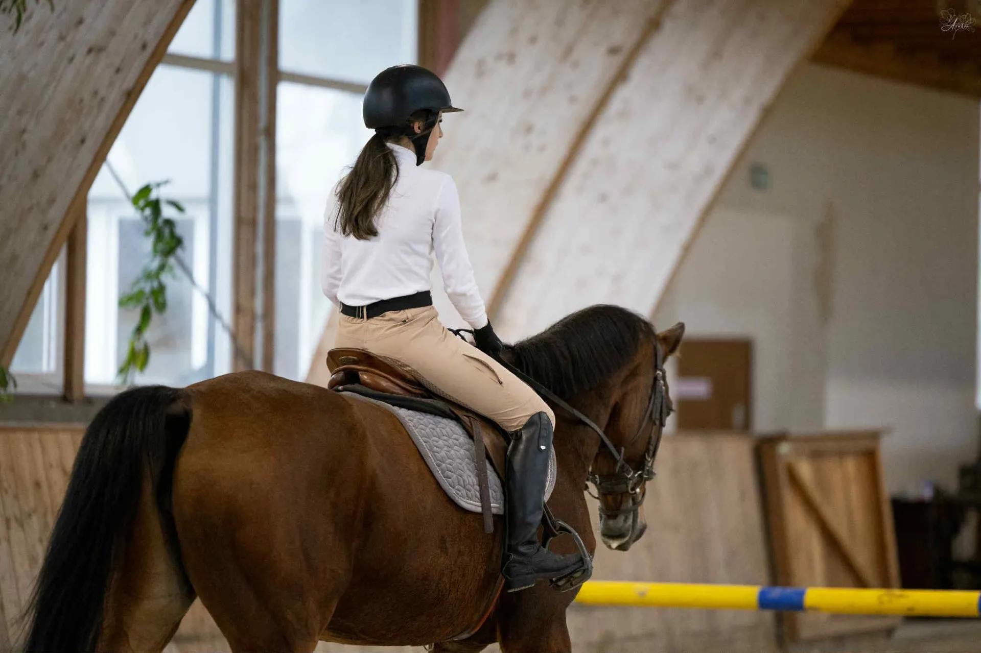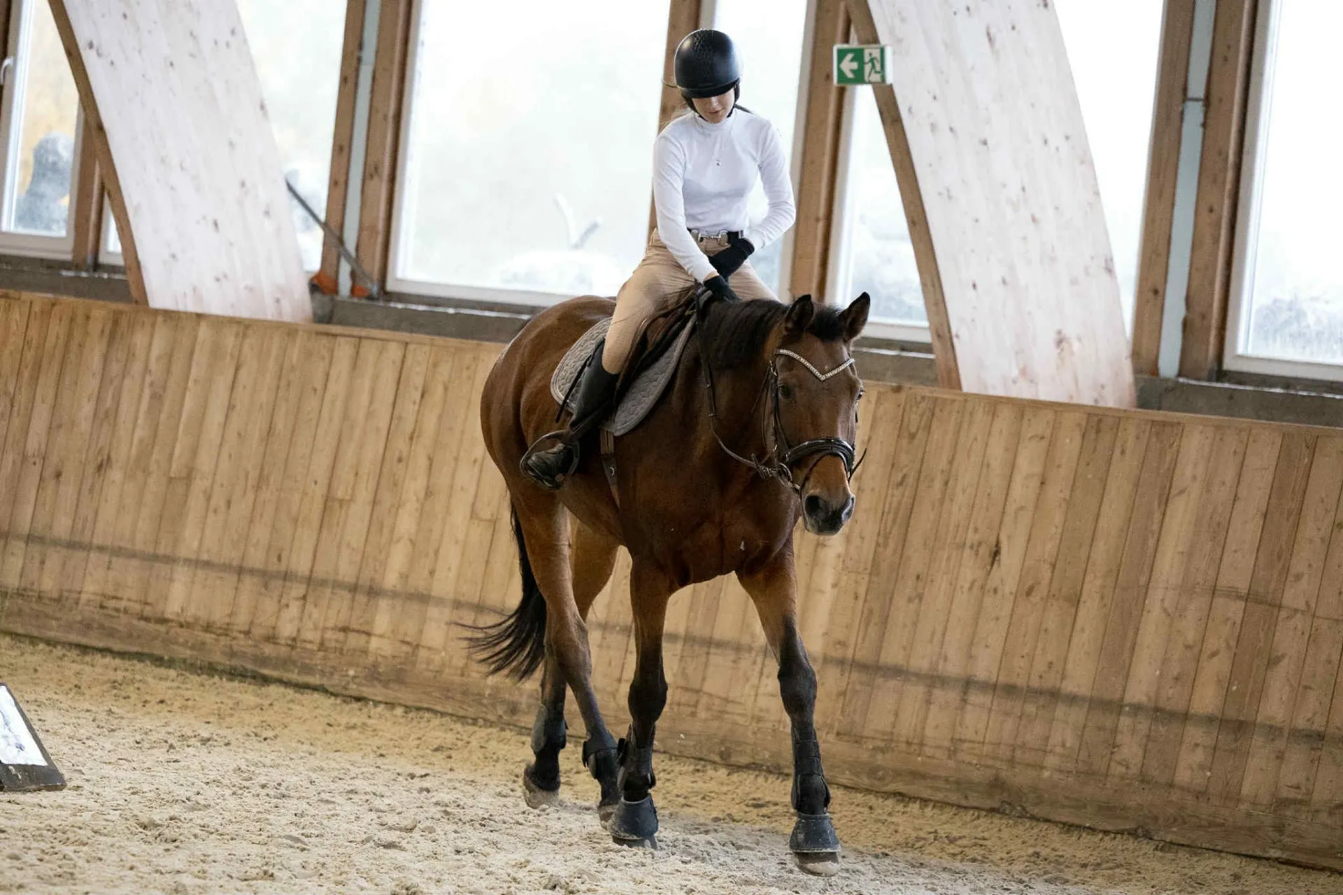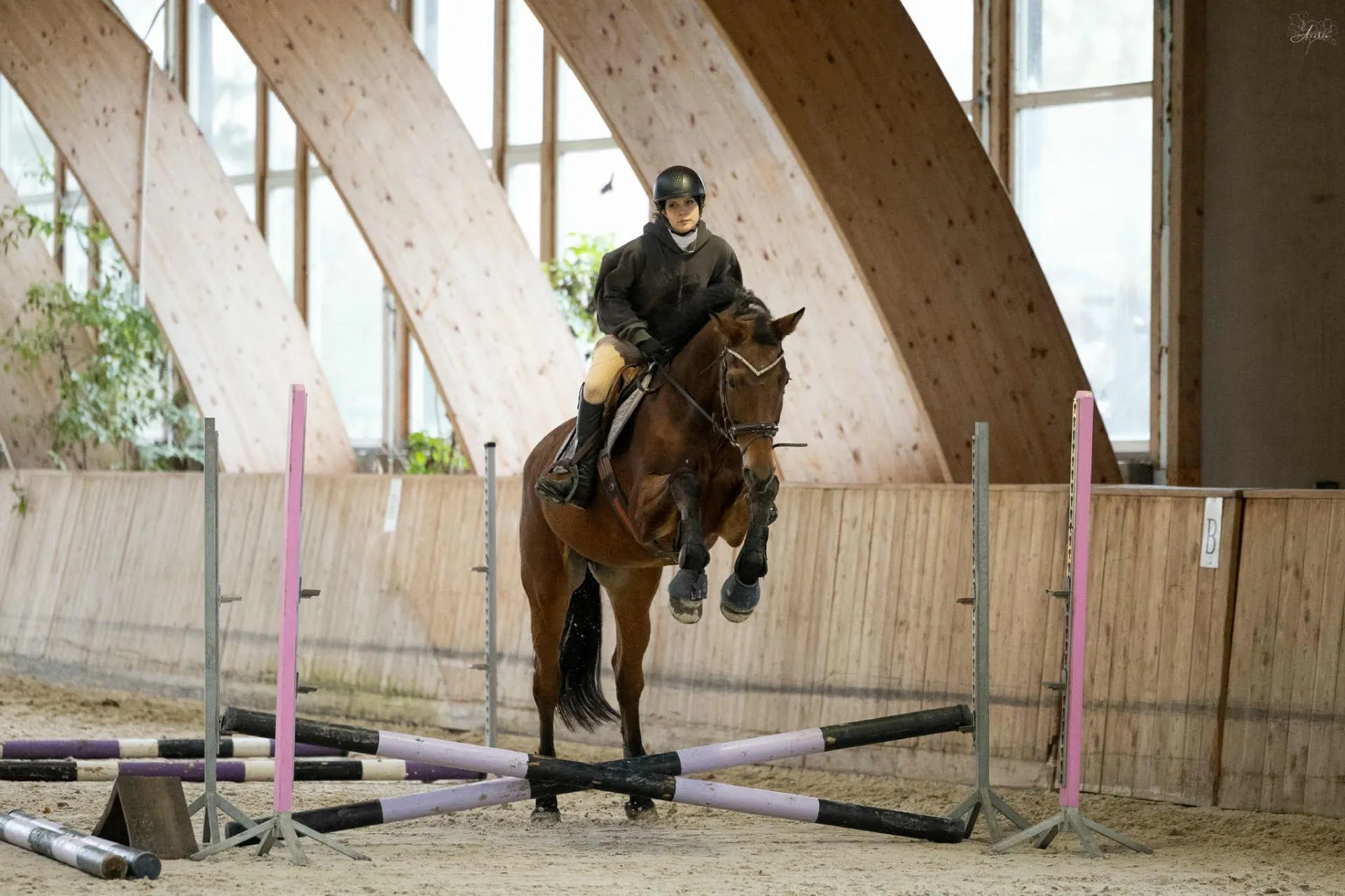 Klacz została zajeżdżona na początku tego roku, w treningu od 2 miesięcy więc nie jest wyeksploatowana. W domu naskakana do metra, w korytarzu do 145 włącznie. Nowe miejsca nie robią na niej żadnego wrażenia.