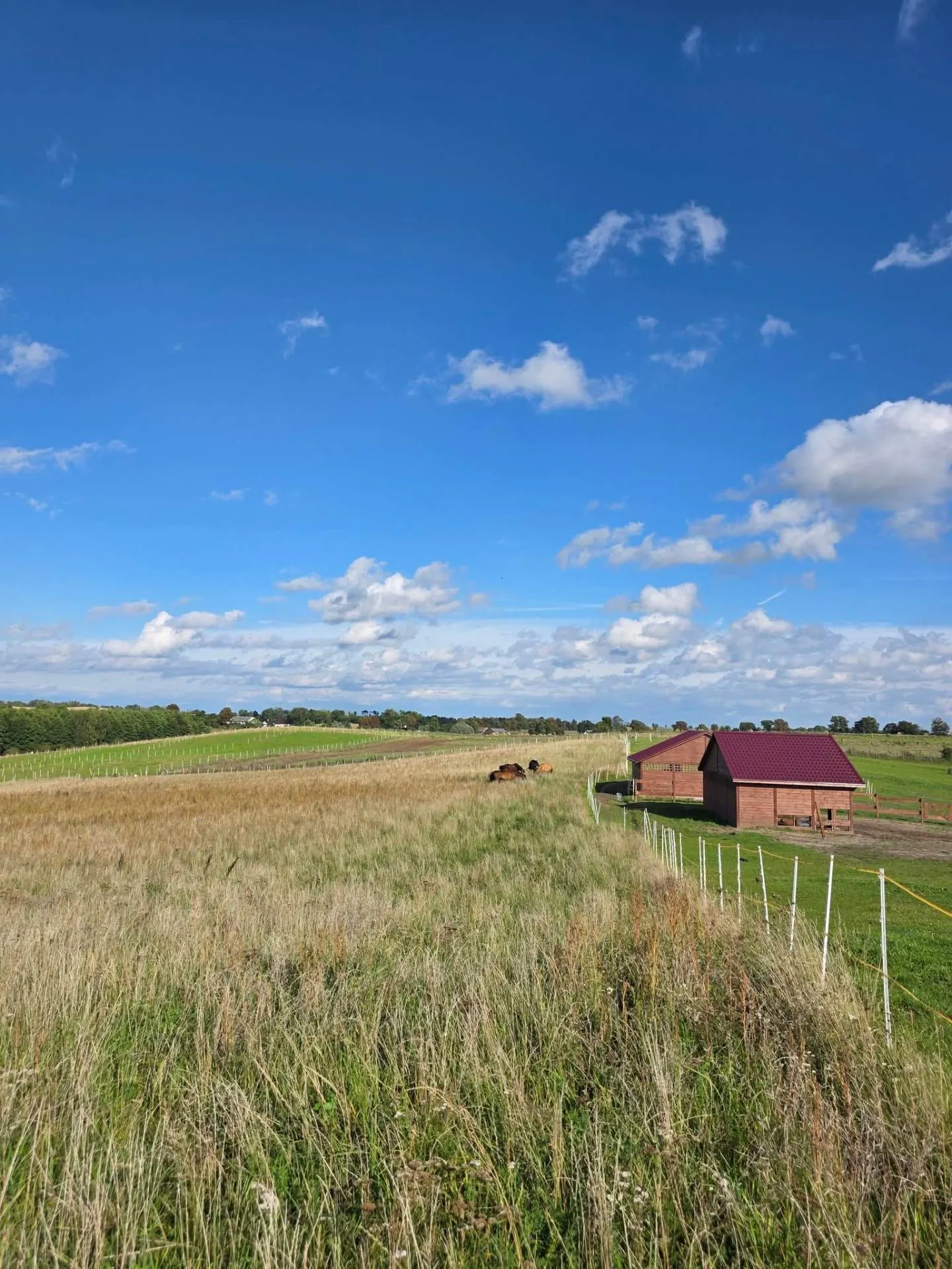 🥕 System wolnowybiegowy na 8 hektarach urozmaiconego, mocno pagórkowatego terenu z dużymi łąkami.